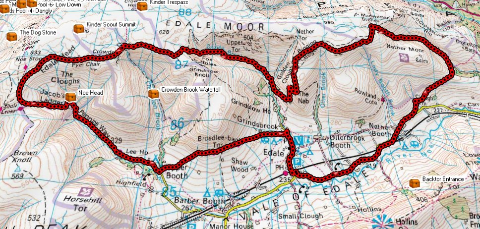 From past experiences I've found Jagger's Clough and Grindsbrook to be pretty tough ascents so I knocked up a route that started at Edale, headed East and then up Jagger's Clough, West along the top, descend by Ringing Roger, ascend back up Grindsbrook, further West, South and then East down Jacob's Ladder and back to Edale.